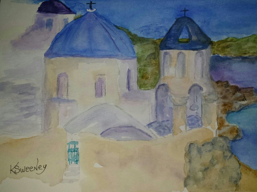 When Mike and I left the grueling two year project we were on in the Middle East; we did what expats call “R&R”. Rest and Relaxation! I like this term because when I say I am going on “R&R” I actually do just that. Vacations tend to get out of hand and find me going back to work more exhausted than when I left. We arrived at our R&R, a small village on the island of Mykonos, Greece, to find that our villa was on a hill side with an incredible view of the Aegean Sea from one balcony and a view of the little village on the cove from the other balcony. It was perfect for a painter! However, it was so stunning that the blue greens of the sea and the whitewashed buildings and walkways overwhelmed my senses. Alas, the grandeur never got presented on my paper during that trip. I have been trying to paint that delightful memory since. I still don’t have it perfected; but today I present my latest attempt. …